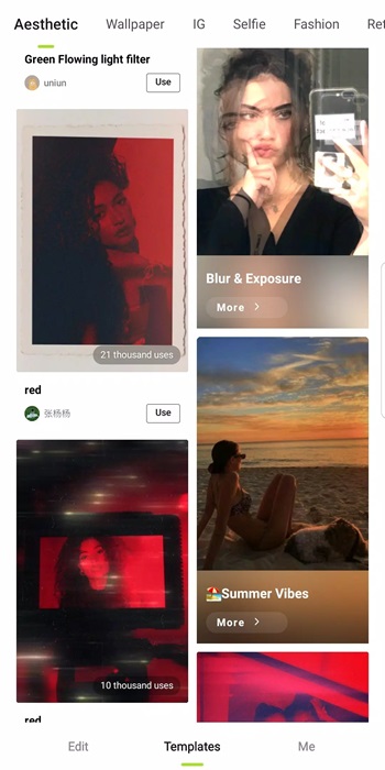 - Home Screen: Displays quick access to features like filters, templates, and beauty tools, ensuring a smooth workflow.